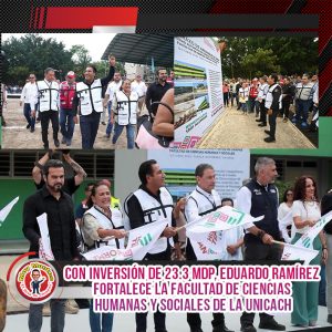 El gobernador Eduardo Ramírez Aguilar dio el banderazo de inicio a la construcción de nuevos espacios en la Facultad de Ciencias Humanas y Sociales de la Universidad de Ciencias y Artes de Chiapas (Unicach), con una inversión superior a 23.3 millones de pesos, en beneficio de más de mil 300 estudiantes. En este marco, reafirmó su compromiso de seguir invirtiendo en la ampliación y fortalecimiento de la infraestructura educativa, con el objetivo de garantizar mejores condiciones de enseñanza a la