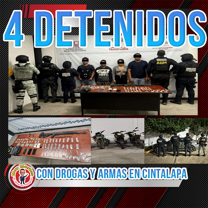La Fiscalía General del Estado, la Guardia Nacional y la Secretaría de Seguridad del Pueblo detuvieron a Faustino “N”, Fernando “N”, Miguel “N” y Miriam “N”, como presuntos responsables de los delitos contra la salud en su modalidad de narcomenudeo con la variante de posesión de metanfetamina y marihuana con fines de comercio, así como de violación a la Ley Federal de armas de fuego y explosivos, por hechos ocurridos en el municipio de Cintalapa.