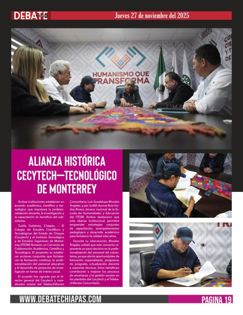 Tuxtla Gutiérrez, Chiapas. – El Colegio de Estudios Científicos y Tecnológicos del Estado de Chiapas (Cecytech) y el Instituto Tecnológico y de Estudios Superiores de Monterrey (ITESM) firmaron un Convenio de Colaboración Académica, Científica y Tecnológica. El propósito es establecer acciones conjuntas que fortalezcan la formación continua, la profesionalización del personal educativo y el desarrollo de proyectos de investigación en temas de interés social.