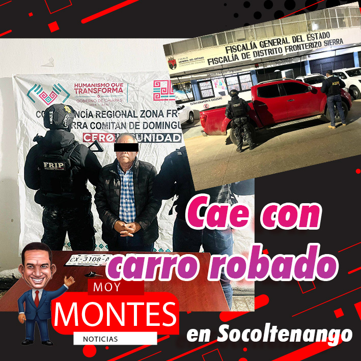 La Fiscalía General del Estado y la Secretaría de Seguridad del Pueblo detuvieron a Antonio “N”, como presunto responsable del delito de robo de vehículo en la modalidad de ocultamiento, cometido en agravio de quien o quienes resulten ofendidos, por hechos ocurridos en el barrio Puentecito, municipio de Socoltenango.