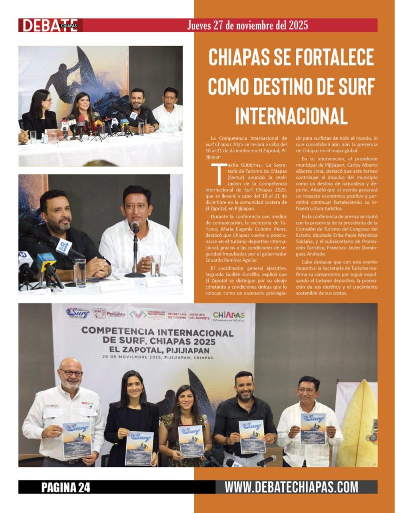 Tuxtla Gutiérrez.- La Secretaría de Turismo de Chiapas (Sectur) anunció la realización de la Competencia Internacional de Surf Chiapas 2025, que se llevará a cabo del 18 al 21 de diciembre en la comunidad costera de El Zapotal, en Pijijiapan.