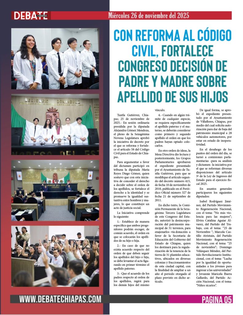 Tuxtla Gutiérrez, Chiapas; 25 de noviembre de 2025.- En sesión ordinaria presidida por la diputada Alejandra Gómez Mendoza, el pleno de la Sexagésima Novena Legislatura aprobó la iniciativa de decreto por el que se reforma y fortalece el artículo 58 del Código Civil para el Estado de Chiapas.