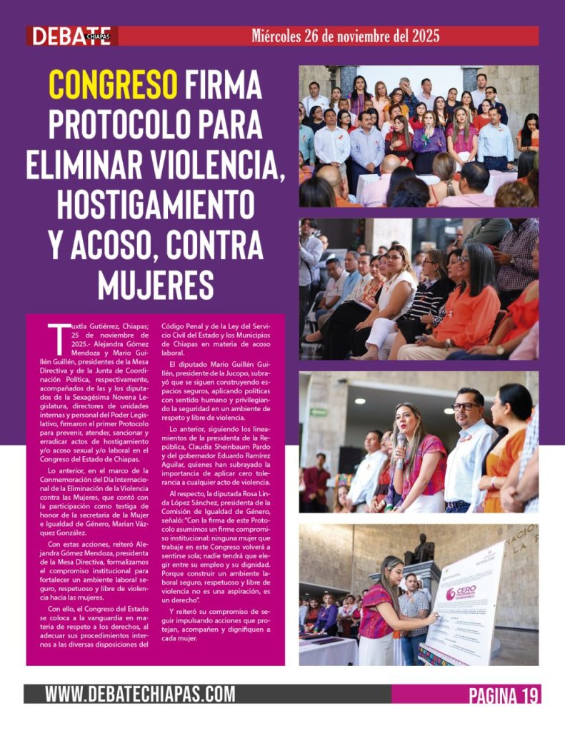 Tuxtla Gutiérrez, Chiapas; 25 de noviembre de 2025.- Alejandra Gómez Mendoza y Mario Guillén Guillén, presidentes de la Mesa Directiva y de la Junta de Coordinación Política, respectivamente, acompañados de las y los diputados de la Sexagésima Novena Legislatura, directores de unidades internas y personal del Poder Legislativo, firmaron el primer Protocolo para prevenir, atender, sancionar y erradicar actos de hostigamiento y/o acoso sexual y/o laboral en el Congreso del Estado de Chiapas.
