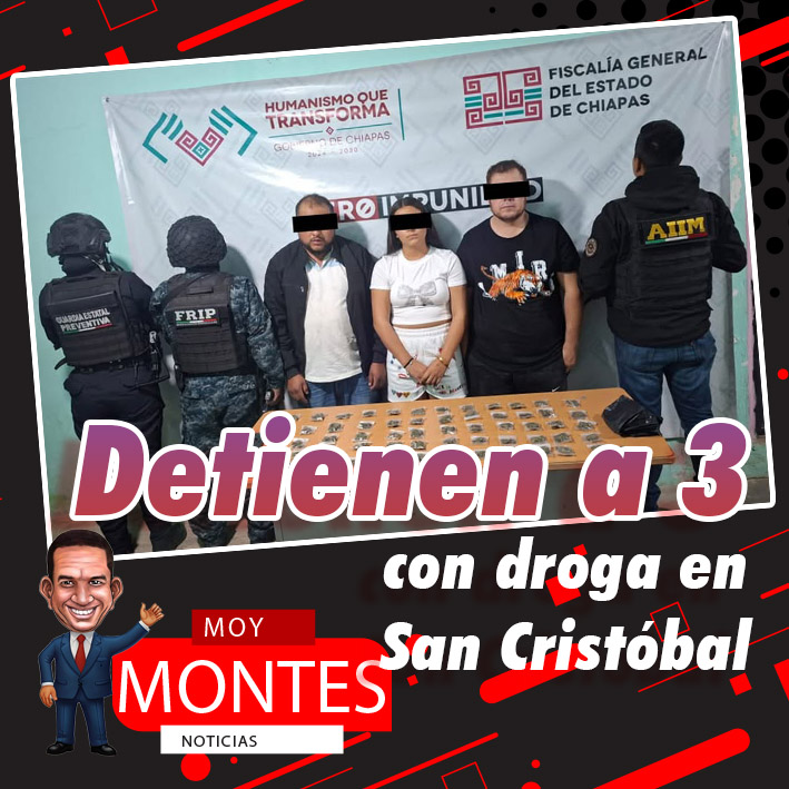 La Fiscalía General del Estado y la Secretaría de Seguridad del Pueblo detuvieron en flagrancia a Cinthia “N”, Artemio “N” y Claudio “N”, como presuntos responsables de los delitos contra la salud y robo de vehículo en su modalidad de traslado, cometido en agravio de quien o quienes resulten ofendidos, por hechos ocurridos en el barrio de Fátima, del municipio de San Cristóbal de Las Casas.