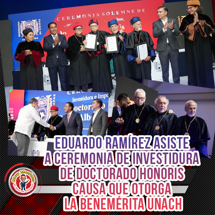 El gobernador Eduardo Ramírez Aguilar asistió a la ceremonia solemne de Investidura e Imposición de Insignias del Doctorado Honoris Causa que otorgó la Benemérita Universidad Autónoma de Chiapas (Unach) al profesor e investigador emérito del Instituto Nacional de Antropología e Historia (INAH), Antonio García de León y Griego; al arqueólogo y escritor guatemalteco, Carlos Alberto Navarrete Cáceres; y al historiador, jurista y promotor cultural chiapaneco, Javier Espinosa Mandujano.
