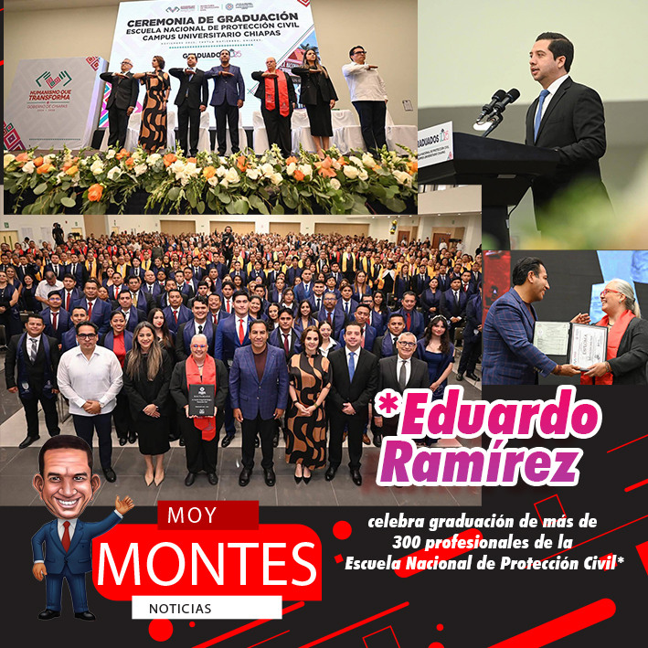 El gobernador Eduardo Ramírez Aguilar asistió a la ceremonia de graduación de estudiantes de licenciatura, maestría y doctorado de la Escuela Nacional de Protección Civil (Enaproc), Campus Universitario Chiapas. En este marco, felicitó a las y los profesionistas y los llamó a desempeñarse con humanismo, lealtad y dedicación, poniendo sus conocimientos al servicio de sus estados y países.