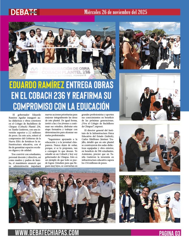 El gobernador Eduardo Ramírez Aguilar inauguró aulas didácticas y obras exteriores en el Colegio de Bachilleres de Chiapas (Cobach) Plantel 236, en Tuxtla Gutiérrez, con una inversión superior a 2.2 millones de pesos. En este acto, reiteró el compromiso del Gobierno de la Nueva ERA de fortalecer la infraestructura educativa, con el fin de garantizar espacios escolares dignos y de calidad.