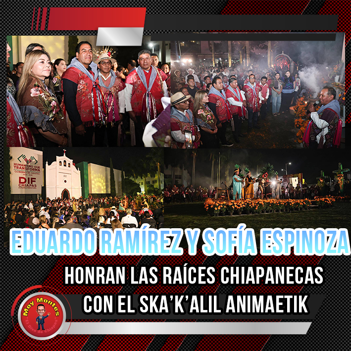 Rodeados por los colores de los tejidos tradicionales, el aroma del cempasúchil, el copal, y la atmósfera de respeto y alegría que acompaña a los rituales del Día de Muertos, el gobernador Eduardo Ramírez Aguilar y la señora Sofía Espinoza Abarca inauguraron el Ska’k’alil animaetik, una representación de la celebración tradicional de Zinacantán, en las instalaciones del Sistema DIF Chiapas, en Tuxtla Gutiérrez.