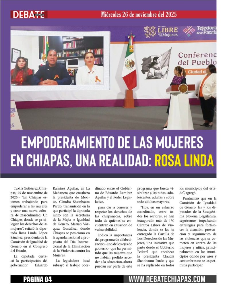La diputada destacó la participación del gobernador Eduardo Ramírez Aguilar, en La Mañanera que encabeza la presidenta de México, Claudia Sheinbaum Pardo, transmisión en la que participó la diputada junto con la secretaria de la Mujer e Igualdad de Género, Marian Vázquez González, donde Chiapas se posicionó en la agenda nacional a propósito del Día Internacional de la Eliminación de la Violencia contra las Mujeres.