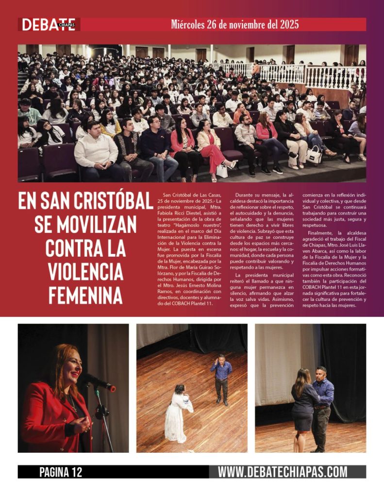 San Cristóbal de Las Casas, 25 de noviembre de 2025.- La presidenta municipal, Mtra. Fabiola Ricci Diestel, asistió a la presentación de la obra de teatro “Hagámoslo nuestro”, realizada en el marco del Día Internacional para la Eliminación de la Violencia contra la Mujer. La puesta en escena fue promovida por la Fiscalía de la Mujer, encabezada por la Mtra. Flor de María Guirao Solórzano, y por la Fiscalía de Derechos Humanos, dirigida por el Mtro. Jesús Ernesto Molina Ramos, en coordinación con directivos, docentes y alumnado del COBACH Plantel 11.