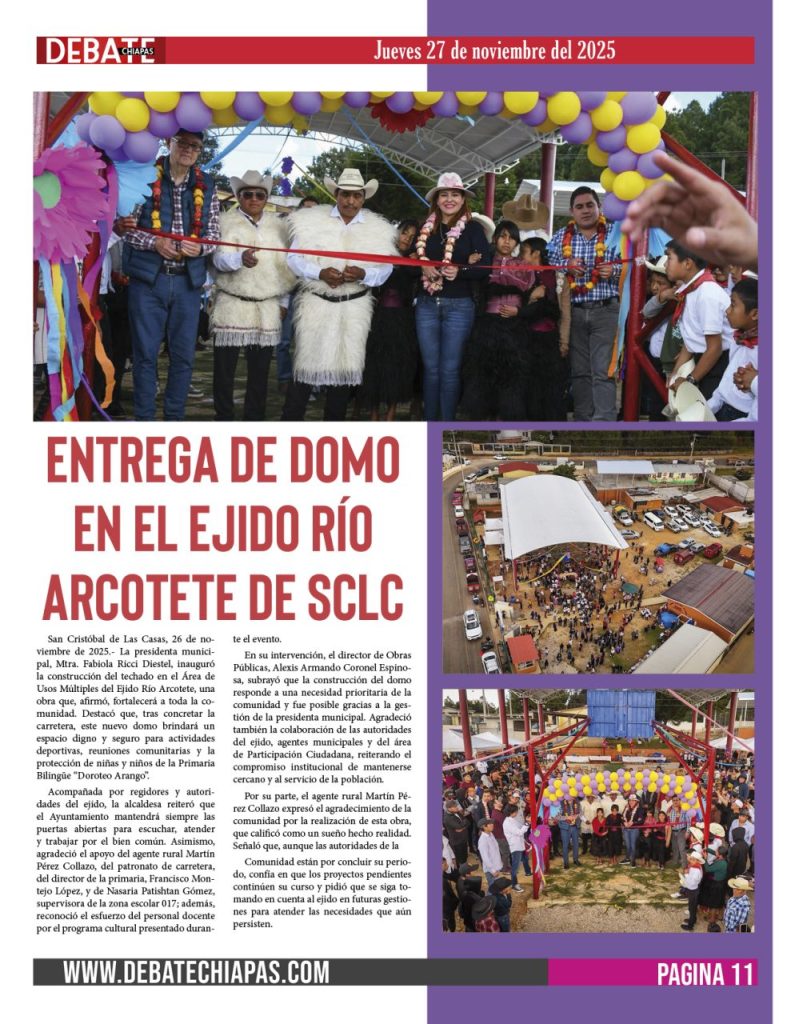 San Cristóbal de Las Casas, 26 de noviembre de 2025.- La presidenta municipal, Mtra. Fabiola Ricci Diestel, inauguró la construcción del techado en el Área de Usos Múltiples del Ejido Río Arcotete, una obra que, afirmó, fortalecerá a toda la comunidad. Destacó que, tras concretar la carretera, este nuevo domo brindará un espacio digno y seguro para actividades deportivas, reuniones comunitarias y la protección de niñas y niños de la Primaria Bilingüe “Doroteo Arango”.
