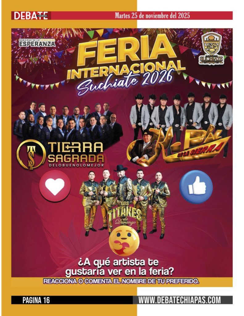 Porque su voz siempre cuenta, hoy les presento la segunda terna de artistas que podrían acompañarnos en la Feria Internacional Suchiate 2026.
