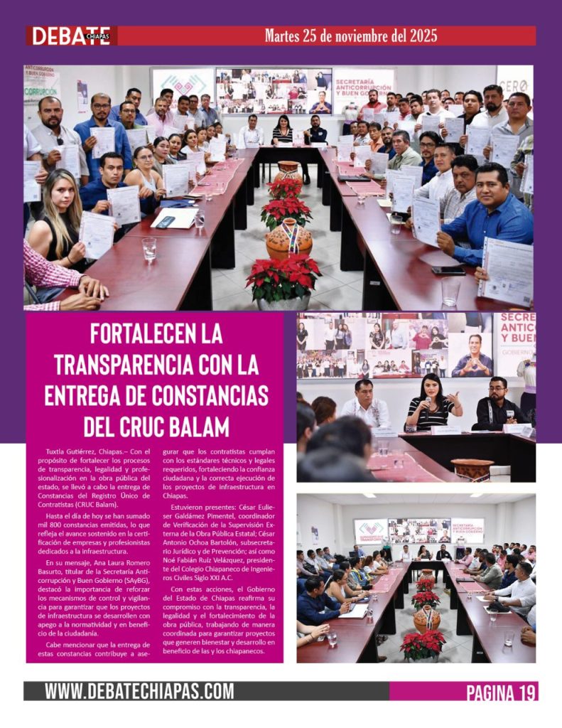 Con estas acciones, el Gobierno del Estado de Chiapas reafirma su compromiso con la transparencia, la legalidad y el fortalecimiento de la obra pública, trabajando de manera coordinada para garantizar proyectos que generen bienestar y desarrollo en beneficio de las y los chiapanecos.