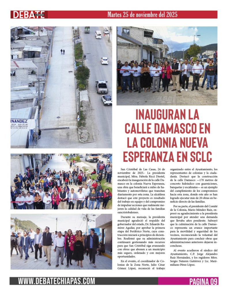 San Cristóbal de Las Casas, 24 de noviembre de 2025.- La presidenta municipal, Mtra. Fabiola Ricci Diestel, encabezó la inauguración de la calle Damasco en la colonia Nueva Esperanza, una obra que beneficiará a miles de habitantes y automovilistas que transitan diariamente por esta zona. La alcaldesa destacó que este proyecto es resultado del trabajo en equipo y del compromiso de impulsar acciones que realmente mejoren la calidad de vida de las familias sancristobalenses.