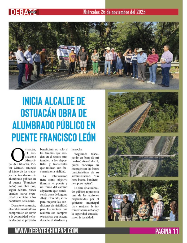 Ostuacán, El Presidente Municipal de Ostuacán, Víctor Manuel, anunció el inicio de los trabajos de instalación de alumbrado público en el puente “Francisco León”, una obra que, según declaró, busca brindar mayor seguridad y utilidad a los habitantes de la zona.