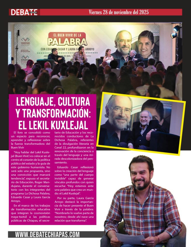 “Hoy hablar del Lekil Kuxlejal (Buen Vivir) es colocar en el centro el corazón de la política pública del estado y la guía de este gobierno humanista. No será solo una propuesta, sino una convicción que marcará tendencia”, expuso el secretario de Educación, Roger Mandujano, durante el conversatorio con los integrantes del programa La Dichosa Palabra, Eduardo Casar y Laura García Arroyo.