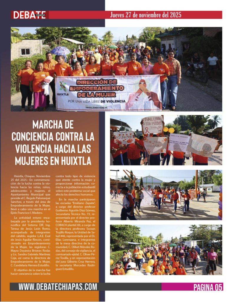 Huixtla, Chiapas. Noviembre 25 del 2025.- En conmemoración de la lucha contra la violencia hacia las niñas, niños, adolescentes y mujeres, el Ayuntamiento Municipal que preside el C. Regulo Palomeque Sánchez, a través del área de Empoderamiento de la Mujer, llevó a cabo una marcha en el Ejido Francisco I. Madero.