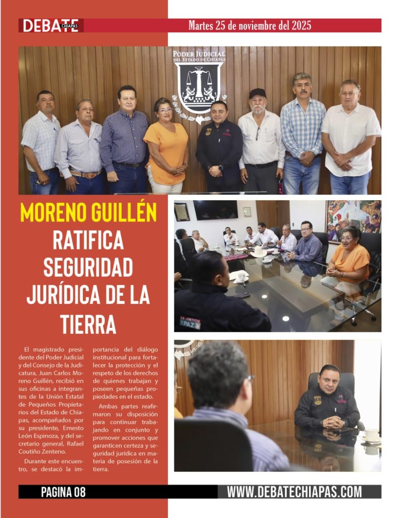 El magistrado presidente del Poder Judicial y del Consejo de la Judicatura, Juan Carlos Moreno Guillén, recibió en sus oficinas a integrantes de la Unión Estatal de Pequeños Propietarios del Estado de Chiapas, acompañados por su presidente, Ernesto León Espinoza, y del secretario general, Rafael Coutiño Zenteno.