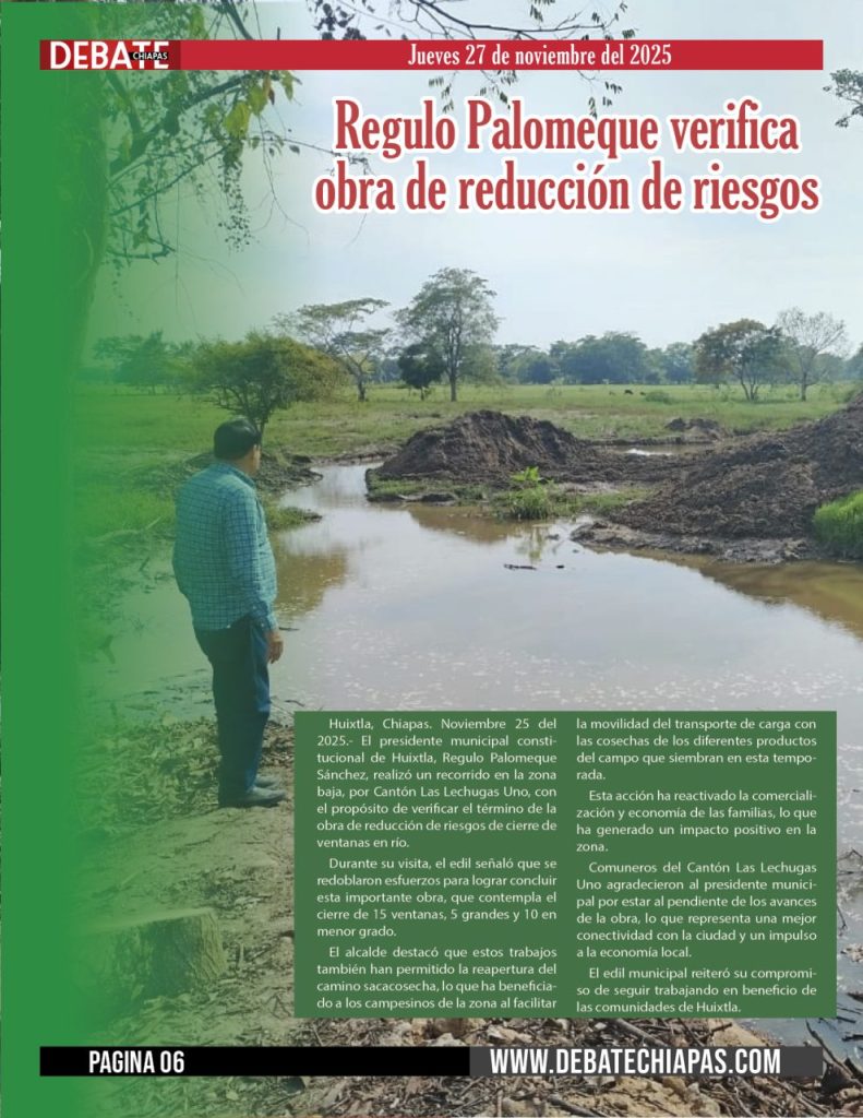 Huixtla, Chiapas. Noviembre 25 del 2025.- El presidente municipal constitucional de Huixtla, Regulo Palomeque Sánchez, realizó un recorrido en la zona baja, por Cantón Las Lechugas Uno, con el propósito de verificar el término de la obra de reducción de riesgos de cierre de ventanas en río.