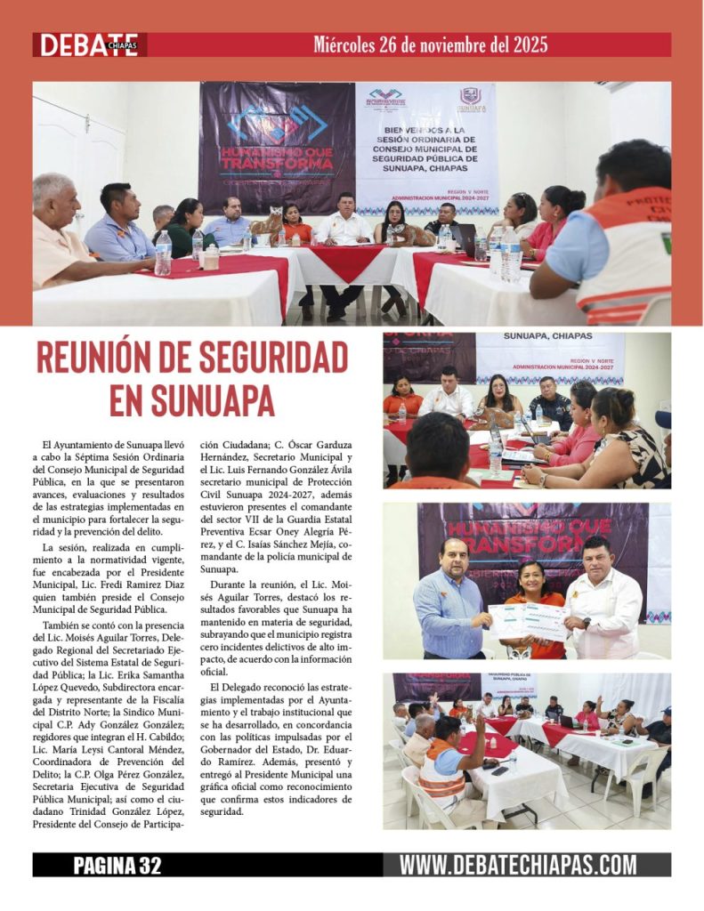 Durante la reunión, el Lic. Moisés Aguilar Torres, destacó los resultados favorables que Sunuapa ha mantenido en materia de seguridad, subrayando que el municipio registra cero incidentes delictivos de alto impacto, de acuerdo con la información oficial.
