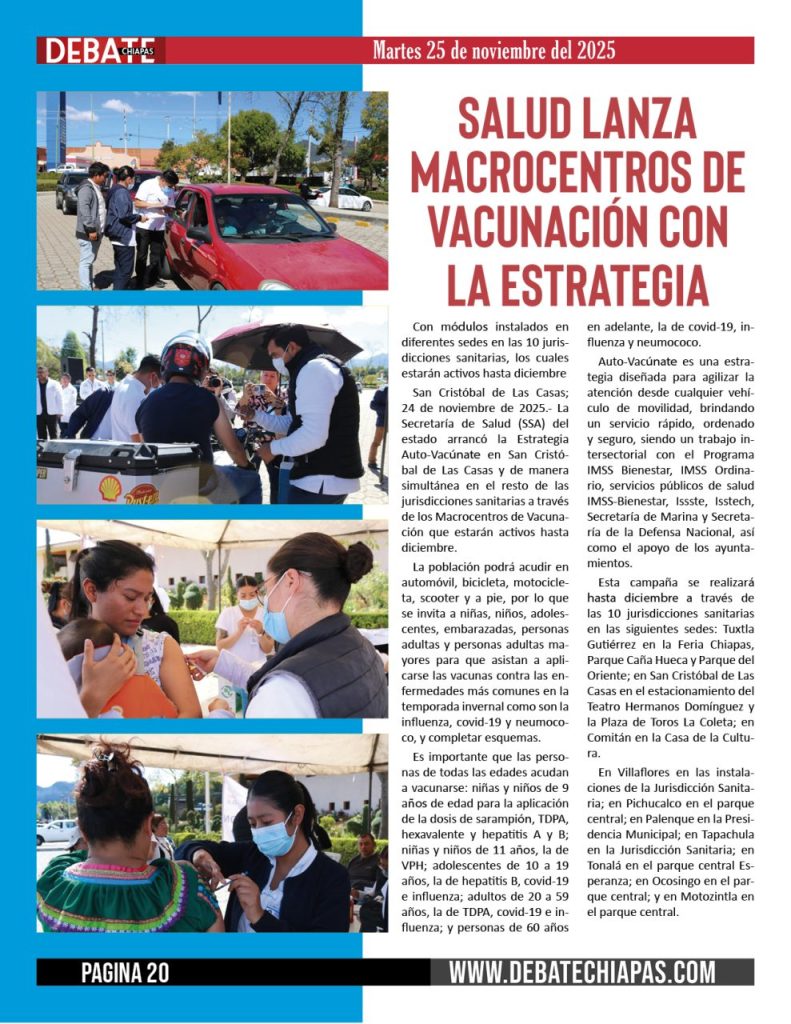 San Cristóbal de Las Casas; 24 de noviembre de 2025.- La Secretaría de Salud (SSA) del estado arrancó la Estrategia Auto-Vacúnate en San Cristóbal de Las Casas y de manera simultánea en el resto de las jurisdicciones sanitarias a través de los Macrocentros de Vacunación que estarán activos hasta diciembre.