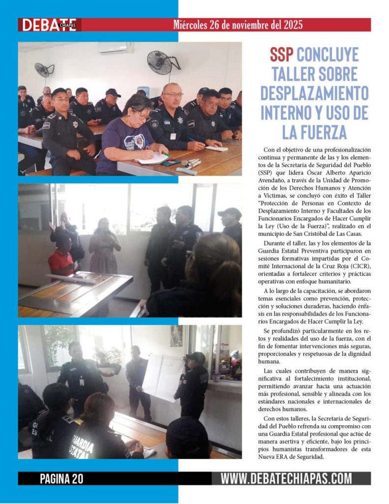 Con el objetivo de una profesionalización continua y permanente de las y los elementos de la Secretaría de Seguridad del Pueblo (SSP) que lidera Óscar Alberto Aparicio Avendaño, a través de la Unidad de Promoción de los Derechos Humanos y Atención a Víctimas, se concluyó con éxito el Taller “Protección de Personas en Contexto de Desplazamiento Interno y Facultades de los Funcionarios Encargados de Hacer Cumplir la Ley (Uso de la Fuerza)”, realizado en el municipio de San Cristóbal de Las Casas.
