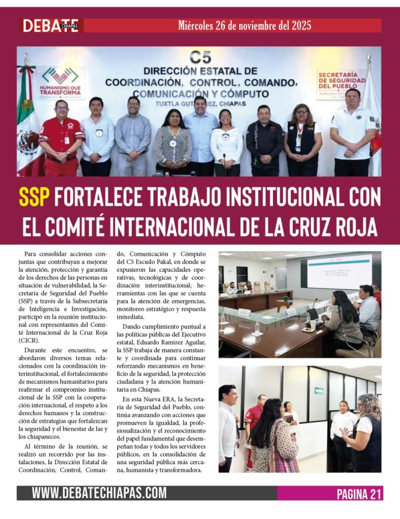 Para consolidar acciones conjuntas que contribuyan a mejorar la atención, protección y garantía de los derechos de las personas en situación de vulnerabilidad, la Secretaría de Seguridad del Pueblo (SSP) a través de la Subsecretaría de Inteligencia e Investigación, participó en la reunión institucional con representantes del Comité Internacional de la Cruz Roja (CICR).