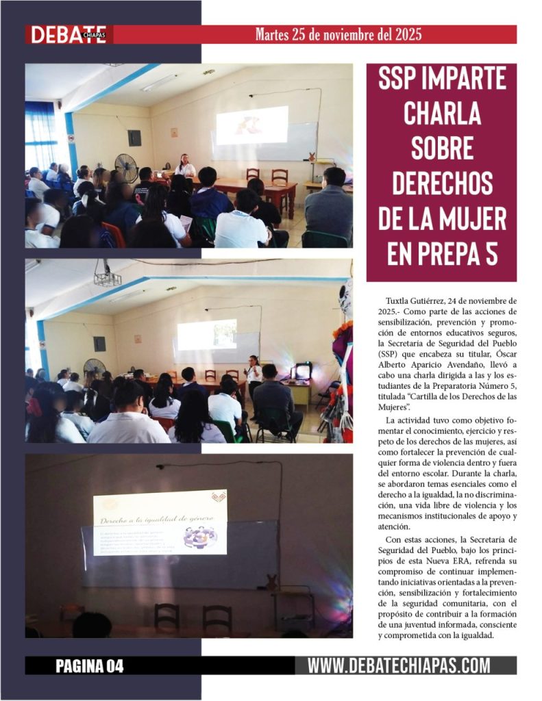 Tuxtla Gutiérrez, 24 de noviembre de 2025.- Como parte de las acciones de sensibilización, prevención y promoción de entornos educativos seguros, la Secretaría de Seguridad del Pueblo (SSP) que encabeza su titular, Óscar Alberto Aparicio Avendaño, llevó a cabo una charla dirigida a las y los estudiantes de la Preparatoria Número 5, titulada “Cartilla de los Derechos de las Mujeres”.