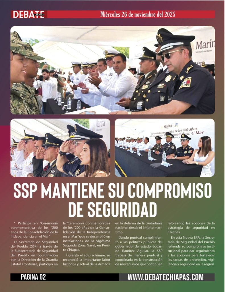 La Secretaría de Seguridad del Pueblo (SSP) a través de la Subsecretaría de Seguridad del Pueblo en coordinación con la Dirección de la Guardia Estatal Fronteriza, participó en la “Ceremonia Conmemorativa de los “200 años de la Consolidación de la Independencia en el Mar” que se desarrolló en instalaciones de la Vigésima Segunda Zona Naval, en Puerto Chiapas.