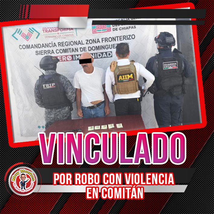 La Fiscalía General del Estado obtuvo la vinculación a proceso en contra de Adrián “N”, como presunto responsable del delito de robo ejecutado con violencia agravada (transeúnte), cometido en agravio de Demis “N”, por hechos ocurridos en el municipio de Comitán, el 26 de septiembre de 2025.